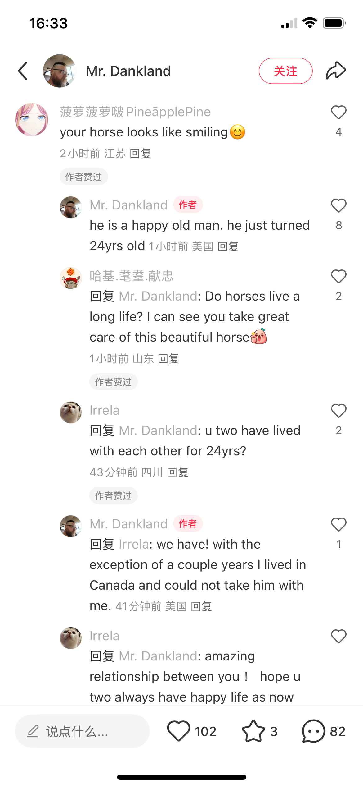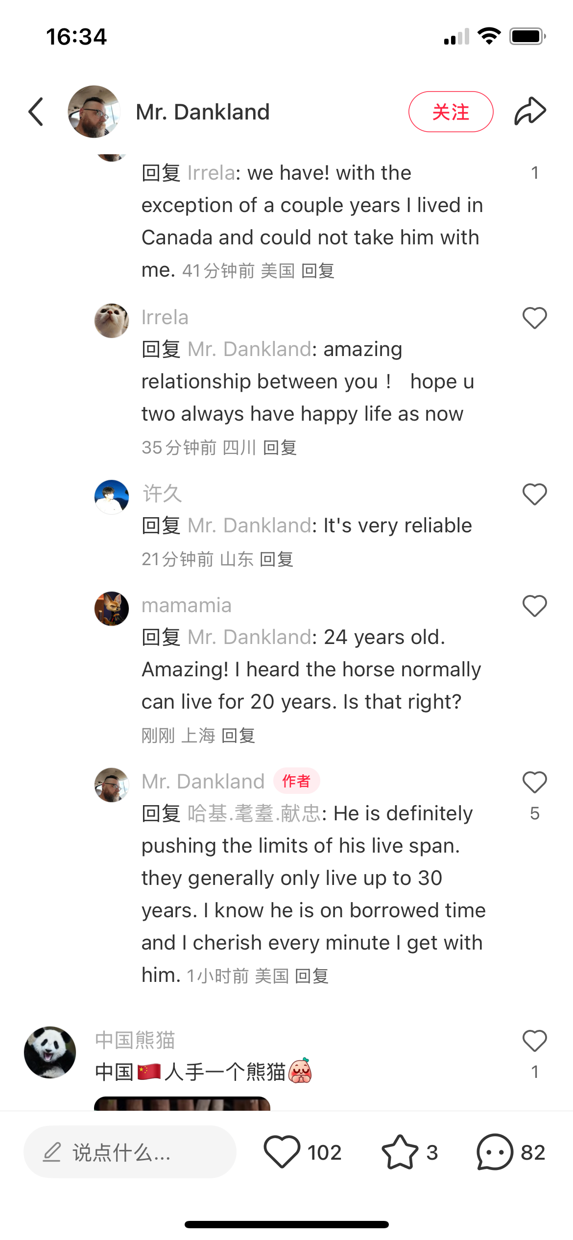 近日来,小红书热闹非凡。Tiktok据说下架美国在即,美国用户都在寻找替代社媒,谁也没想到会是小红书。多日来,中美网友像是很早就认识一样,彼此开玩笑,交猫税,不得不说,这些应该是美国精英用户,制作的社交内容也非常丰富。小红书的推送也有更多内容精品出现。还有一些对话相当动人:这位美国老兄养了一匹年迈的马。